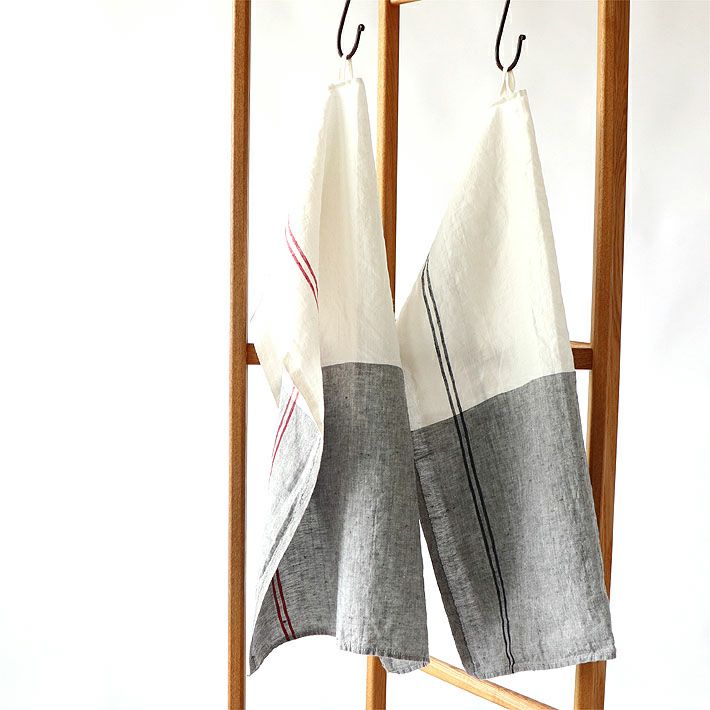 白×グレイの爽やかなキッチンクロスです。サイドに入った赤や紺の2本ラインが引き締め役に。 無機質でいてどこか落ち着きあるシンプルなデザインはインテリアにもしっくり馴染み、男性にも喜ばれそうですね。