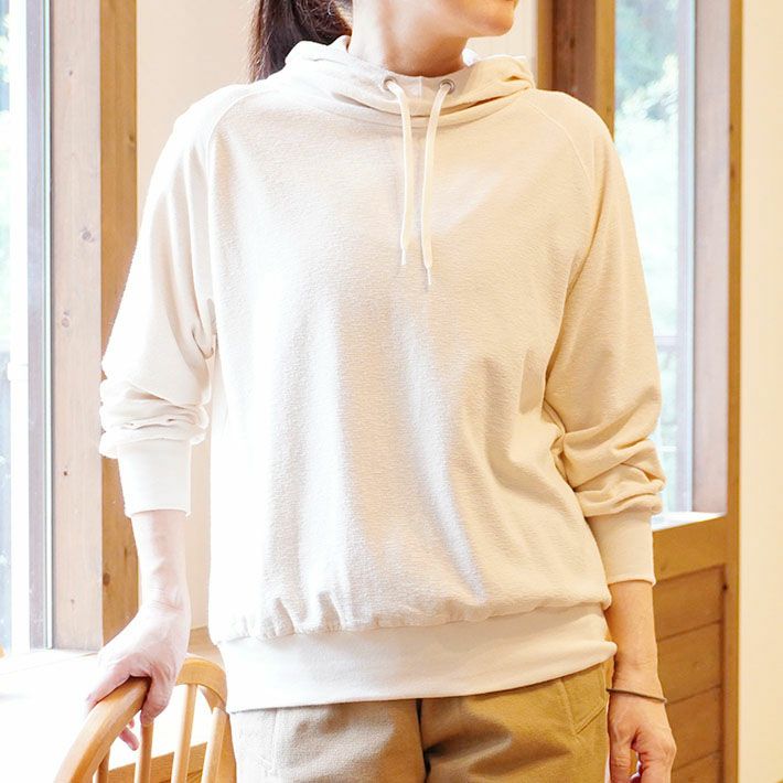 フードが首もとに立ち上がることで、重ね着した時にも自然な立体感をプラス。 ロングベストやカーディガンのインナーに合わせれば、奥行きのあるレイヤースタイルが楽しめます。