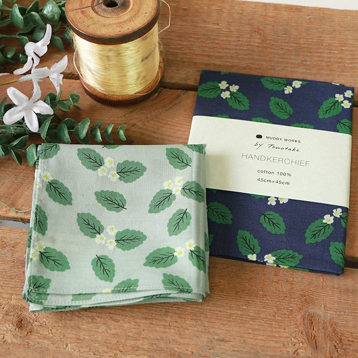 ※‘MUDDY WORKS‘ハンカチシリーズには、ガーゼ素材の『木々』柄、『ボール遊び』や、サテン素材の『オオデマリ』もございます。