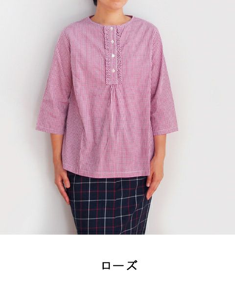 さわやかな綿素材のギンガムチェックを使って、前立てにミニフリルを付けたラフなプルオーバーです。