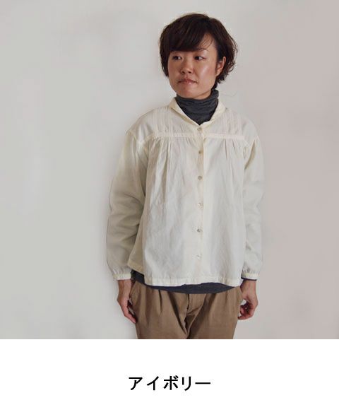 小さな衿がポイントの、前にタックの入ったふんわりしたシャツです。