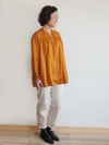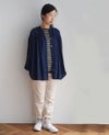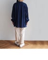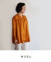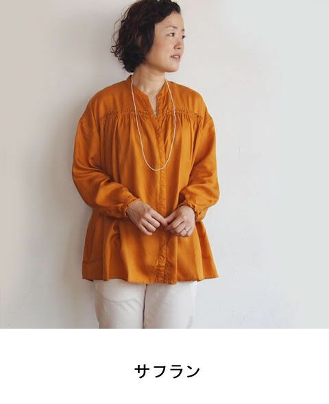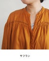 胸元の小さなフリル、ゆったりとした女性らしいシルエットを、細めのスタンドカラーがすっきりとシャープにまとめています。