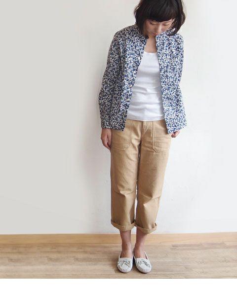 品のあるリバティプリント生地を丸衿シャツに仕立てました。