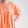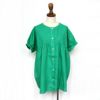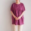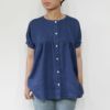 前後のヨーク下にたっぷりとギャザーを入れた、ふんわりしたシルエットの前開きブラウス。