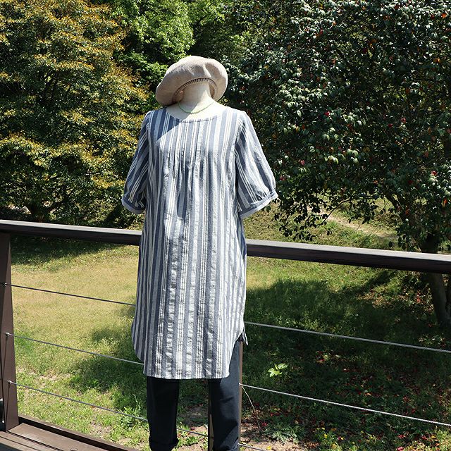 胸元にピンタックを施した、ほどよいボートネックのロング丈チュニック。 肩巾を小さくすることで、袖ぐりにゆとりを持たせ着脱も着やすくしています。 ややボリュームのある袖が二の腕をカバーし、かわいらしさをプラスしています。 細身のパンツとあわせることで、バランスよくコーディネイトしていただけます。