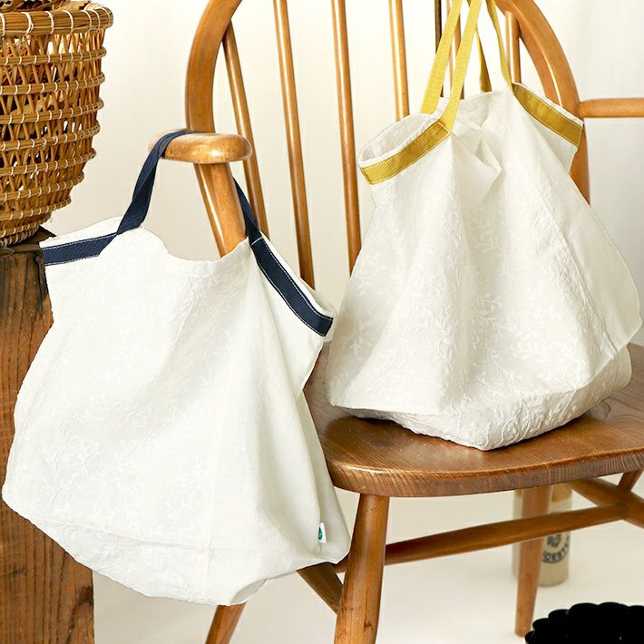 買い物やちょっとしたお出かけに必需品となったエコバッグ。森の8カテンでは、キッチン雑貨やマスクでおなじみのリネン刺繍生地を使った、小さめバッグを作りました。