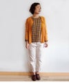 カットソーは薄くて軽さのあるベア天竺を使用し、チェック部分のテンセルの光沢感と好相性。