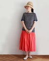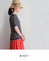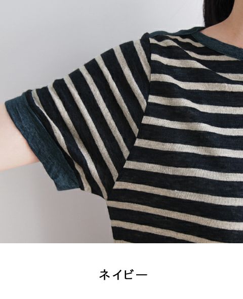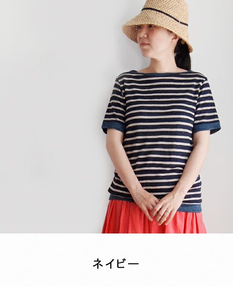 厳選されたリネンを丁寧に編みたてたボーダー柄のリネンジャージ。 夏でもさらりと肌触りよく、軽く柔らかな風合いです。 程よい衿ぐり開きが首元を美しく見せてくれるボートネックTシャツは衿ぐり・袖口・裾を無地でトリミングし、すっきりとした印象です。