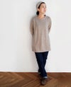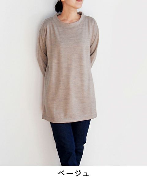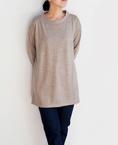 しなやかで上質なウールを使用した、カシミヤのように滑らかな天竺素材。 ドロップショルダーでリラックス感のあるシルエットのチュニックです。 衿元は軽く立ち上がり、柔らかく自然に首に沿うライン。 細身のパンツとのコーディネート、インナーにシャツ合わせもおすすめです。