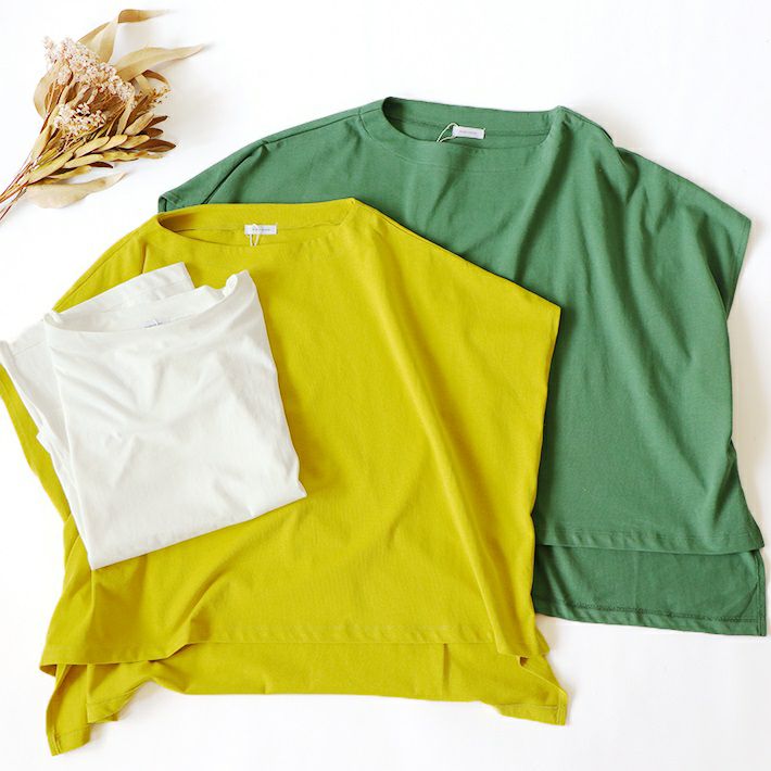 バスト周りが156cmとゆったりした身幅。身頃から袖の切り替えのないフレンチスリーブで袖口幅も広くとってあります。まるでポンチョを羽織っているかのようなシルエットが特徴です。