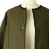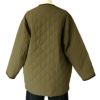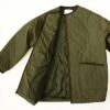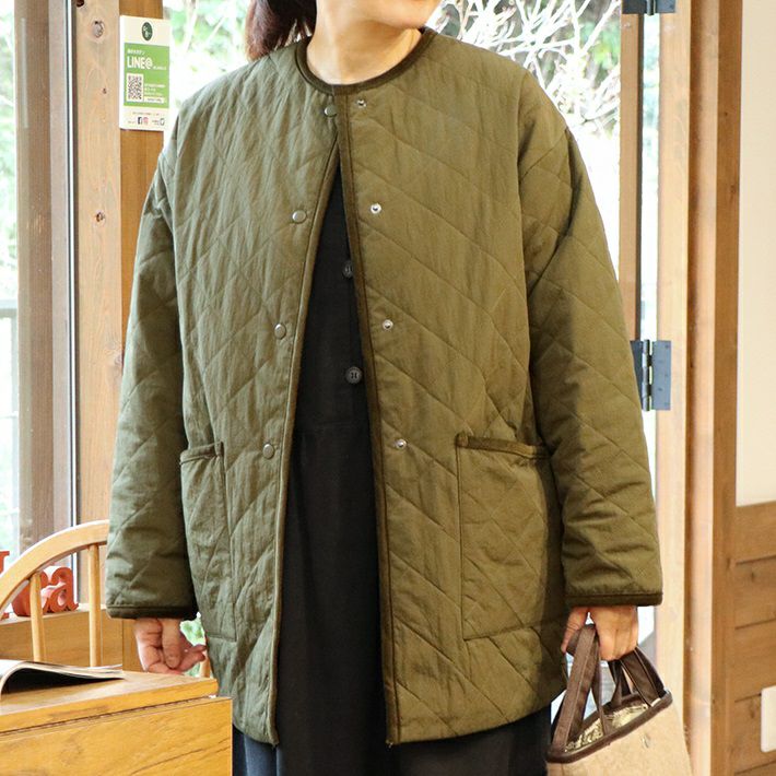 シンプルなノーカラーデザインで着回しやすい、ミドル丈のキルティングコート。丸みのあるコクーンシルエットが、女性らしい印象のデザインです。