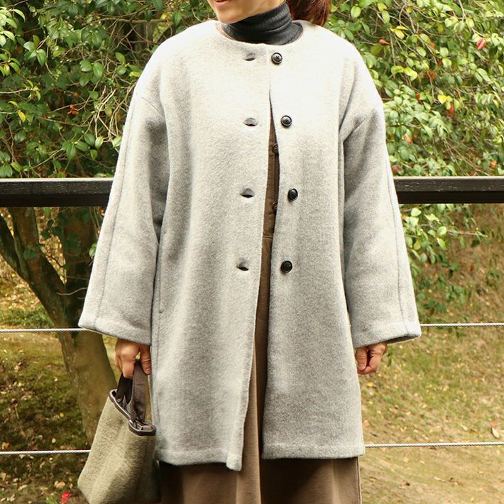 ミドル丈のコクーンシルエット。体を包み込んでくれるようなデザインは落ち着きのある女性らしい雰囲気です。