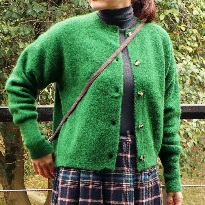柔らかな感触のスーリーアルパカ混。毛足の長さを活かし、シャギー仕上げにしています。とても軽く、ふわふわとした風合いのクルーネックカーディガンです。