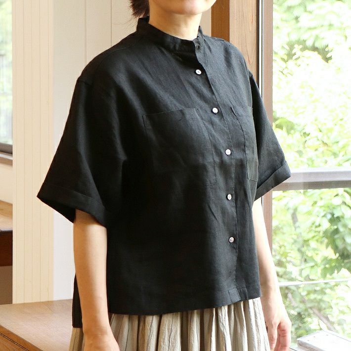 袖口巾が広く、肘の位置までくる大きめな袖が涼しげなシャツは、サファリシャツのような両胸にある貼り付けポケットがカジュアルな雰囲気です。一般的な開襟とは違い、バンドカラーにすることで爽やかで清潔感のある大人のデザインに仕上げています。