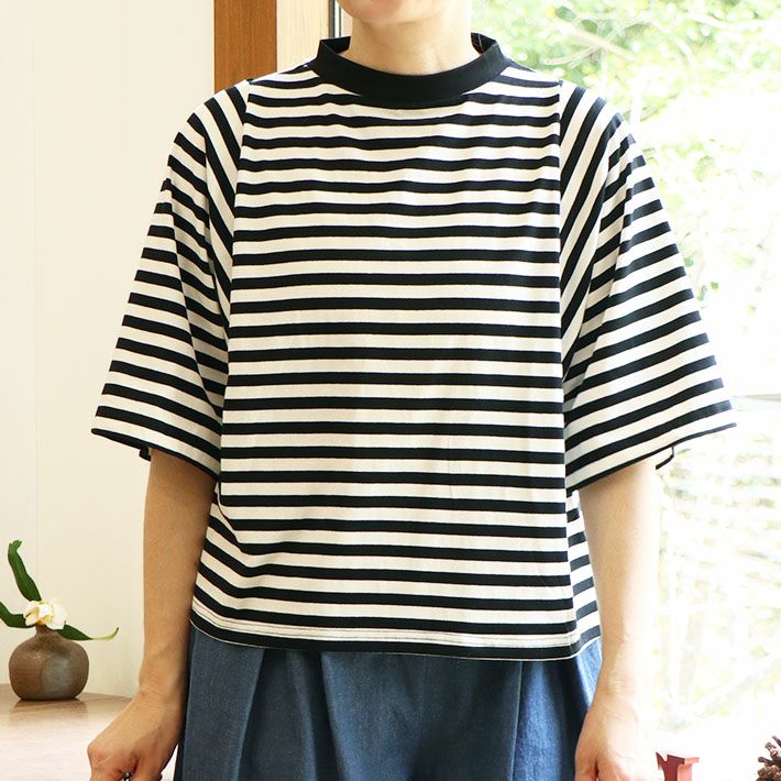 ボトルネックのような、やや詰まった衿ぐり。ボーダーと同じカラーの太めリブがアクセントです。