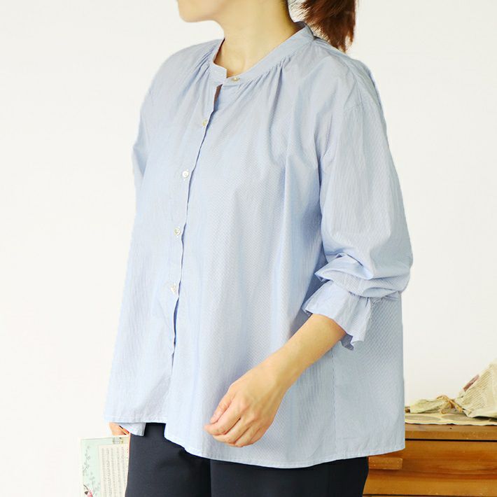 綿100%素材の細いストライプ柄を使ったブラウスです。衿ぐりや袖口にたっぷり入ったギャザーがアクセント。
