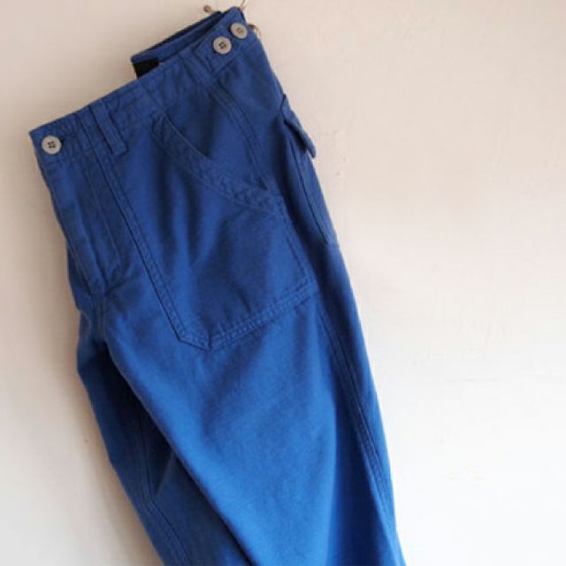 肌触りのよいバックサテンを製品染めしています。 くたっとした表情が粗野ないいバランスを生み出しています。 8分丈なので、ロールアップしても、ブーツと合わせてもコーディネイトを楽しめます。 両脇ウエストには、調節可能のボタンループ付き。