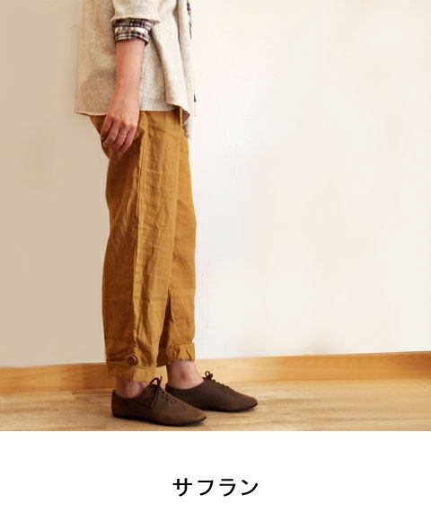 プレーンでベーシックな平織りのリネンワッシャー。 風通しがよく、洗いざらしたような風合いが肌に馴染みます。 細すぎず、太すぎず気負わず履けるストレートイージータイプ。 裾をボタンタブでロールアップできます。 ウエストはファスナー+ボタンに調節可能な共ヒモ付き。