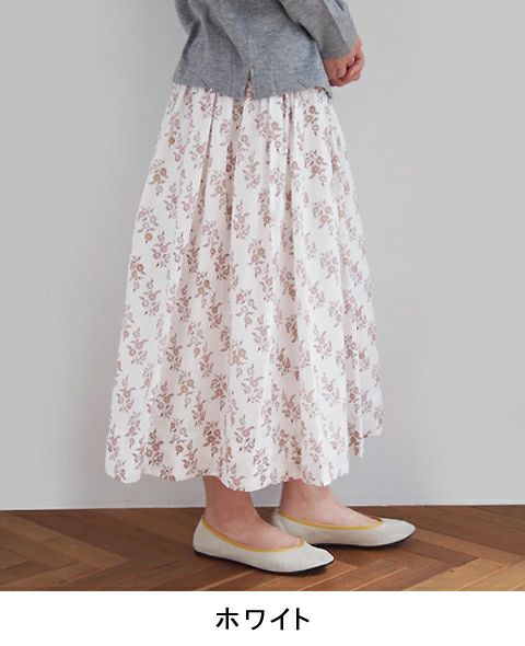 落ちついた小さめの花柄が女性らしい、rolca on the notes(ロルカ オン ザ ノーツ)のミドル丈スカート。 シンプルでラフなタッチの花柄を薄手の綿麻素材にプリントしました。 たっぷりとギャザーをとったふくらみのあるシルエットは、ひざ下丈でふわりと揺れる軽やかな1枚です。 (裏地あり)