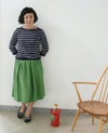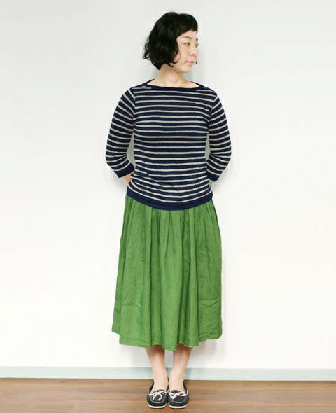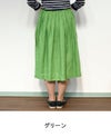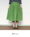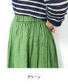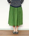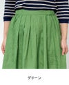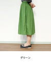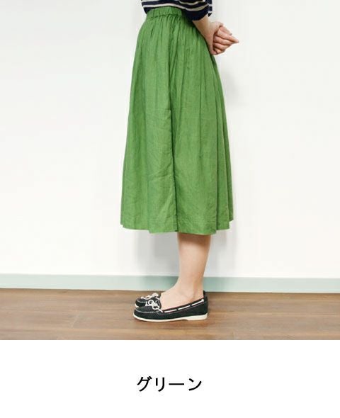 発色の良さが魅力のリネン100%の素材。 ややざっくりしたハリのある生地は、着るほど洗い込むほどに肌に馴染んでいきます。 裏地はないものの、透け感が気にならず涼やかに着られるのも嬉しいポイント。 ウエストの両側にゴムを入れ、前後にはタックをとったスカートはふんわりとしたひざ下丈です。 (裏地なし)