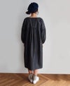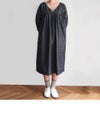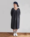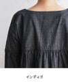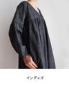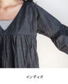 GIZAコットンを使用した光沢感のあるインディゴシャンブレー。 ムラのある糸を使って表情を出した、ハリのある生地です。 深めのVネックで胸元をすっきり見せ、切替から下はギャザーをたっぷり入れたボリュームのあるシルエットです。