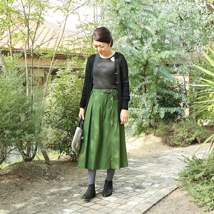 発色の良いボタニーウールを使った、rolca on the notes(ロルカ オン ザ ノーツ)のタックフレアスカートです。(裏地付き) 綾目がきれいに立ち、光沢感のあるボタニーウール100%。保温性や伸縮性に優れた上質ウールです。 柔らかく肌触りも良いので、しなやかなラインがミドル丈のスカートをより女性らしく表現してくれます。 ウエストの取り外しできる共布リボンで、トップスをインした時もコーディネートのポイントに。左脇側のボタンは落ち着きのあるベージュを使い、クラシカルな雰囲気です。