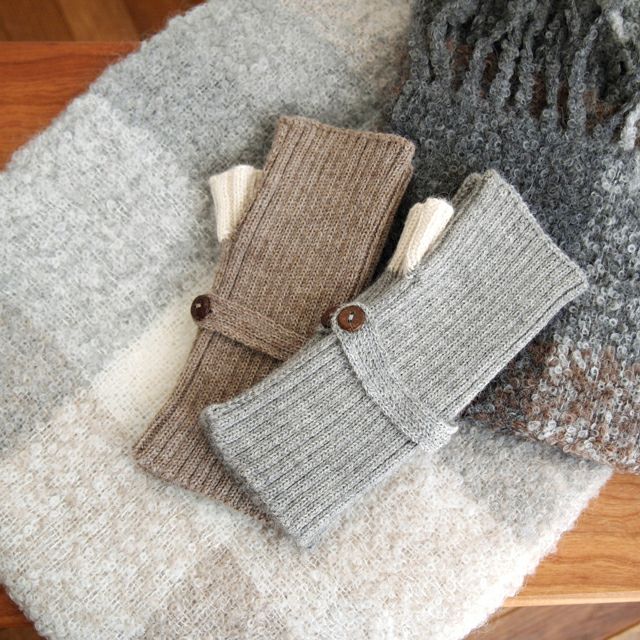 ベビーアルパカ100%で編まれた、Lino e Lina(リーノ エ リーナ)のハンドウォーマー。 リブ編みのラインと、手首にフィットする細身のデザインが、全体にすっきりした印象を与えます。 飾りのベルトとウッドボタンがアクセントに。 親指の配色が、控えめながら存在感を主張します。