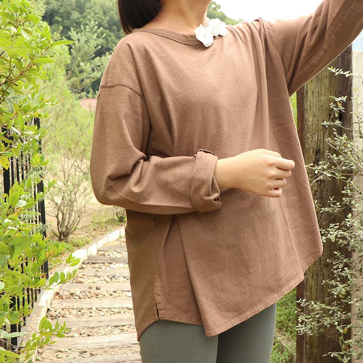 プレーンなボートネックでゆったりした着心地。衿ぐりの始末には縫い代をきれいに巻き込まず、生地を断ち切りのままのデザインに。素朴なムラ糸天竺に加え、さらにカジュアル感を感じる仕様です。