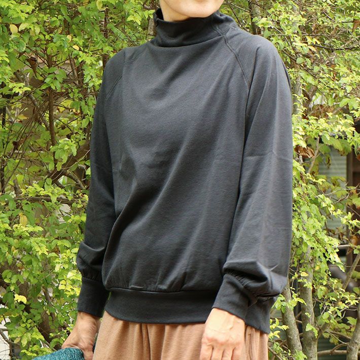 袖付けはラグラン仕様。そのラグラン線からつながって立ち上がった衿が、ほどよいゆとりを持った首周りに。しなやかな生地感とともに、女性らしさのあるネックデザインです。