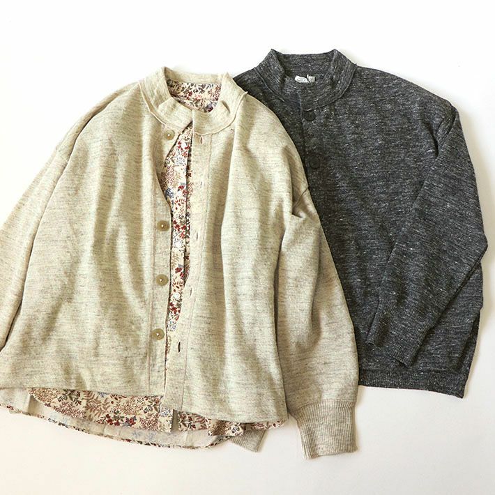 ゆったりとした身幅のスタンドカラーカーディガン。ストンとしたボックスシルエットです。