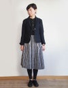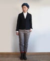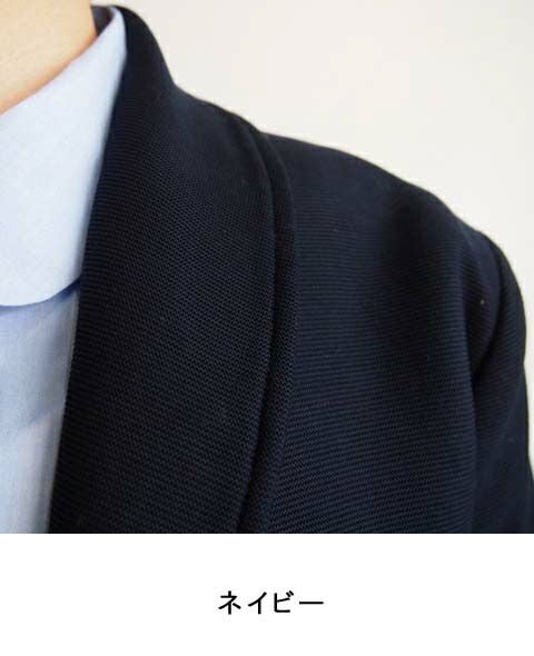 伸縮性のある綿の両面裏目使いのガーター編みカットソーで裏無しジャケットを作りました。 横目が立つように編まれており表面の凹凸もあるのでしっかりとした手触りながらもさらりとした表情になっています。 デザインは優しいラインのショールカラ―に切替がアクセントになっています。 シンプルでスカートにもパンツにも相性の良い寸法に仕立てています。