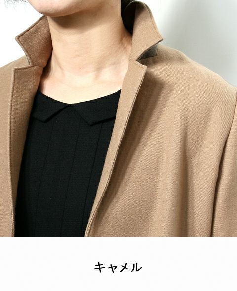 シャープな細身シルエットに似合うよう、衿はやや細めに、前開きは比翼仕立てにまとめました。