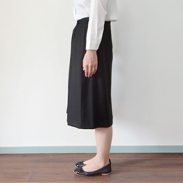 前は動きのあるランダムタック、後ろはウエストゴムで全体にギャザーを入れた、waltz for rolca(ワルツ フォー ロルカ)の膝下丈Aラインスカート。 上品な印象とリラックスの穿き心地が両立するアイテムに仕上がりました。 気になる重みもなく、お手持ちのジャケットと合わせてカジュアルにもキレイ目にも。 トップスをインして着こなせば、表情のあるタックが楽しめます。 (裏地なし)