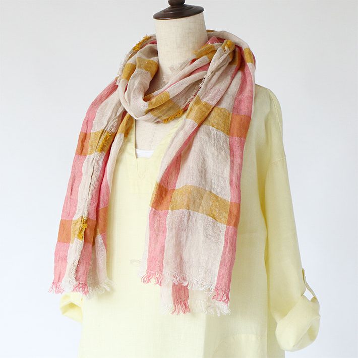 涼しげな透け感が魅力のリネン100%「Lino e Lina(リーノ・エ・リーナ)」のリネンストールです。 ガーゼのような甘織りでふんわりとした素材感。ナチュラルベースに発色あるイエローやブルーを掛け合わせた 元気なイメージのチェック柄です。 washed加工を施した柔らかい肌触りのリネン素材は、首回りがチクチクするのが苦手な方にもおすすめ。 他の素材にはない風合いが魅力です。 また、洗濯機で洗っていただけるのでお手入れも簡単(必ずネットに入れてください)。 上質なリネンなので、毛羽立ちが少ないのもうれしいポイントです。