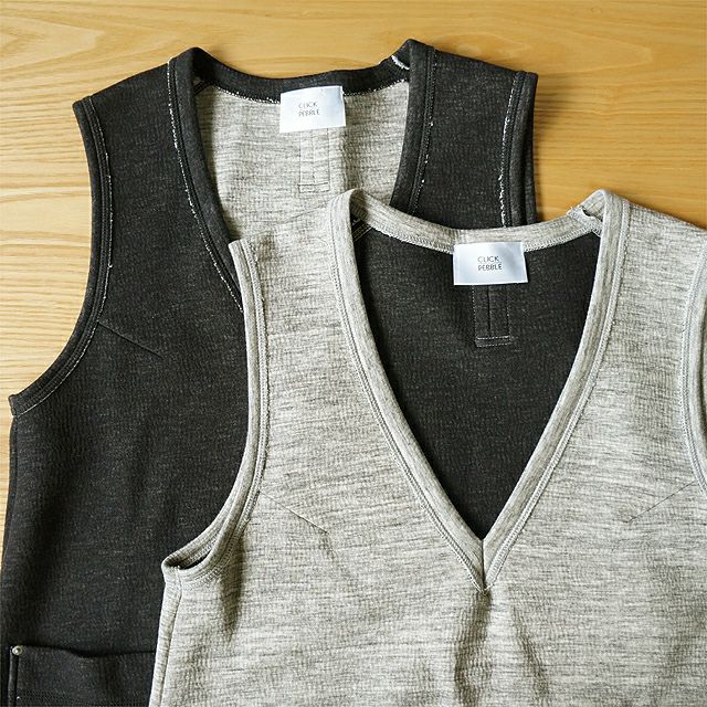 CLICK PEBBLE(クリック ぺブル)の、コットン段ボールベスト。 名前の通り段ボールのような、表と裏の間に太い糸を渡した三重の構造で、ボリューム感がありながら軽量で弾力のある素材です。 製品洗いをする事で表面が縮み細かいシボができて表情豊かになっています。