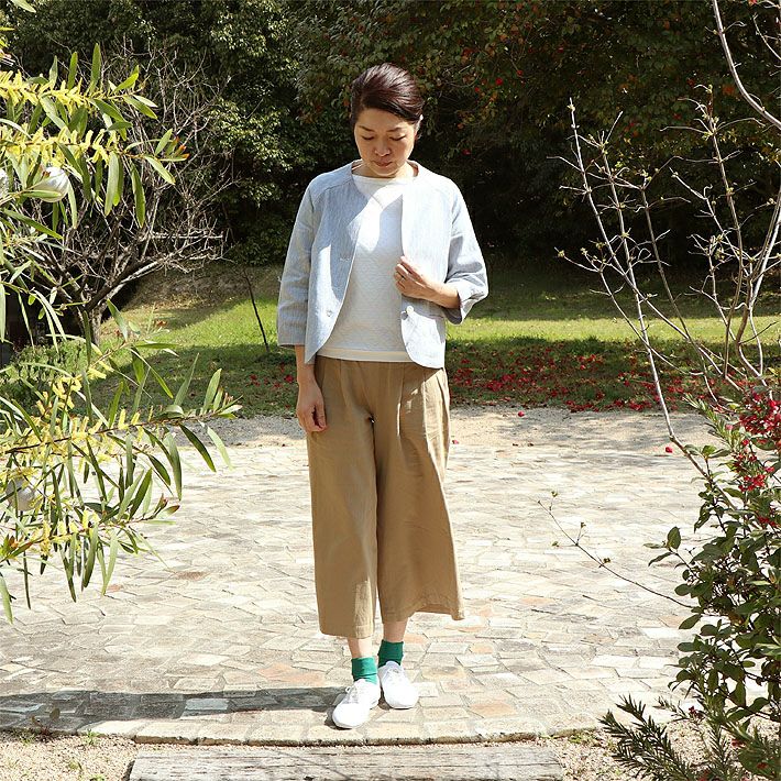 形はヒップから裾に向かってやや広がるシルエット。まとわりつくことなく軽快に穿いていただけます。