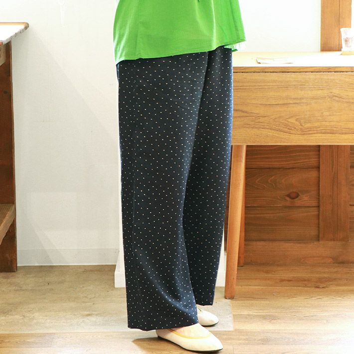 麻100%地にドット(水玉)がランダムにプリントされた「waltz for rolca(ワルツ フォー ロルカ)」のイージーパンツです。