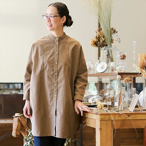 コンパクトなスタンドカラーに対して、ボリュームのある身頃感が特徴のロングシャツ。 やや厚みのあるライトモールスキンに顔料染めを施し、柔らかく繊細な起毛感を出しています。 上質で滑らかな肌触り。 洗い込むことで永年変化も楽しめます。 重たくなり過ぎないように袖は9分丈にし、両脇のシャツカットは深くし、軽さを出しています。 深まった秋冬にも着られ、ロング丈のニットカーディガンやコートとも好相性。 深みのあるベージュとネイビーの2色です。