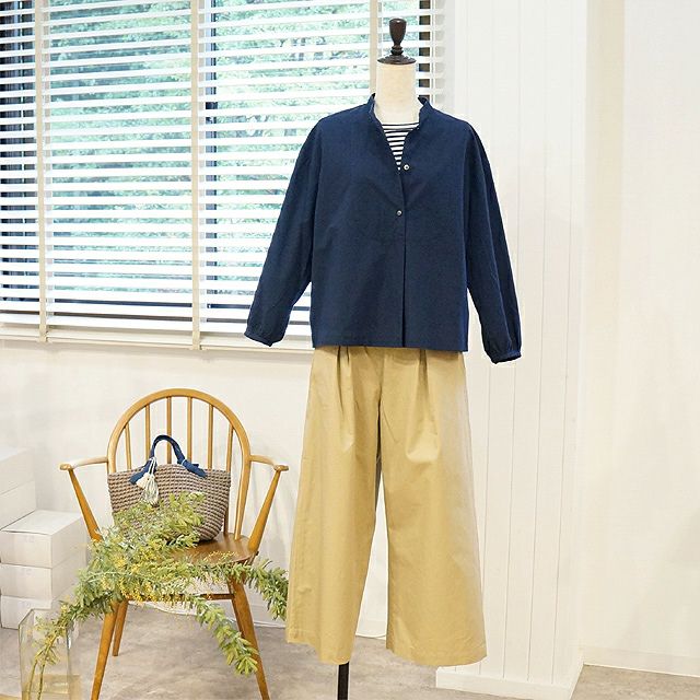 オーバーサイズ気味の身頃に、コンパクトなスタンドカラーがバランスよくマッチした上品でクラシカルなプルオーバーブラウス。 ヨコ糸のスラブ感が独特な表情の綿スラブ生地です。染色時に時間をかけて揉み込みながら染めるとこで、自然なシワ感と柔らかなタッチを表現しました。 生地を乾燥させる際に天日干し風に仕上げることで、よりマットな風合いに。 フロントヨーク下にタックを入れ、前開き風のプルオーバーは、身幅がゆったりしているので、ワイドパンツやスカートとのコーディネートがおすすめです。 スタンドカラーで首周りはすっきりと、袖口にギャザーをいれたパフスリーブがアクセント。
