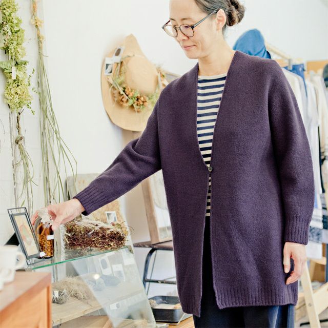 ガーター編みに強圧縮をかけることで軽さとふくらみ、肉感と暖かさのあるロングカーディガンです。 縫い目のないホールガーメント仕様、ドルマンスリーブによる肩のラインを柔らかく包みこんでくれる優しいシルエット。 首に沿うショールカラ―も身頃続きで、羽織り方でアレンジできるようにしました。 ふっくらとした膨らみ感が強く、嵩高性のある品種ベースにした糸を使用した未防縮ウール。 圧縮ニットに仕立てることで、膨らみと肉厚感が増し、軽さと暖かみのあるニットをつくり出します。