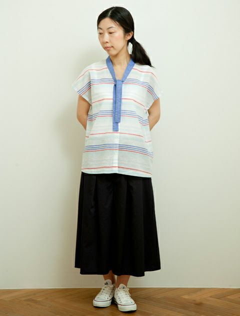 コットンリネンボーダーボータイシャツ