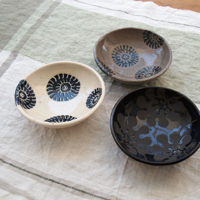 手びねりで形をつくり、その時の土の具合と相談して一つ一つ蝋で模様を描くため、器はそれぞれ違う表情をしています。